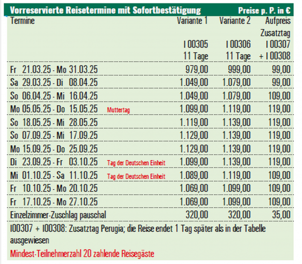 „Kennst du das Land wo die Zitronen blühn?“ So beginnt Goethes schwärmerisches Gedicht über seine „Italienische Reise“, die insgesamt 2 Jahre dauerte. Keine Angst! So lange wollen wir Sie nicht nach Italien entführen. Dennoch werden Sie bei dieser Rundreise einen umfassenden Überblick über die vielfältige Kultur, unbekümmerte Lebensweise, Kulinarik, historische und künstlerische Kostbarkeiten sowie einzigartige Landschaften in diesem klassischen Reiseland ...