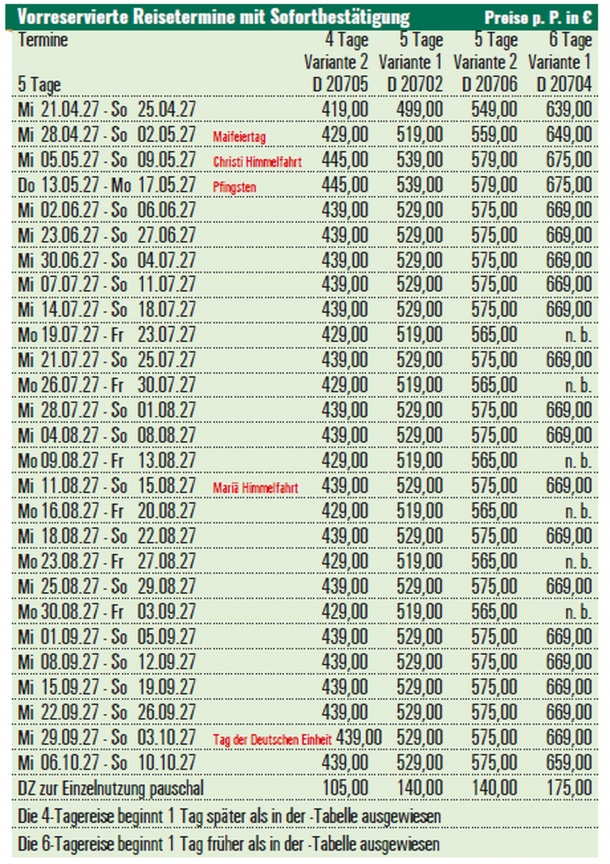 Prüfen Sie, ob am An- und Rückreisetag die aufgeführten Programmpunkte der Variante 2 durchführbar sind – oder ob Sie bei zu großer Anreisedistanz besser die Variante 1 buchen sollten.