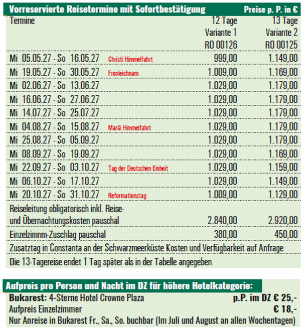 Mare bis Arad bzw. Timisoara obligatorisch, Kosten siehe Termintabelle.