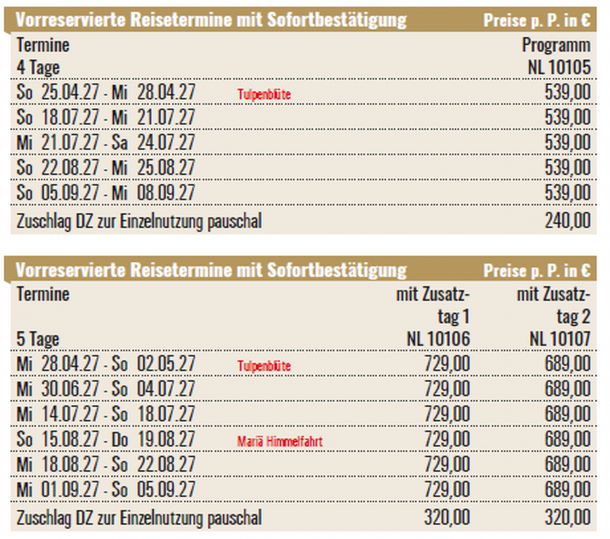 Zusatztag 2: Eintritt Keukenhof (Tulpenblüte-Saison) pro Pers. € 22,00