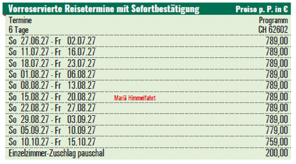 Klein aber fein präsentiert sich unser Nachbarland Schweiz in einer unglaublichen Vielfalt. 4 Sprachzonen auf engstem Raum zeichnen ein kleines Spiegelbild Europas, mehr als 30 Viertausender krönen die Schweizer Alpen, auf unzähligen Seen tummeln sich Segel- und Motorboote, in beschaulichen Bergdörfern wie in Städten werden die Traditionen gepflegt. Berühmte Alpenbahnen erschließen dem Besucher die imposante Bergwelt. Unsere kombinierte Bus- und ...