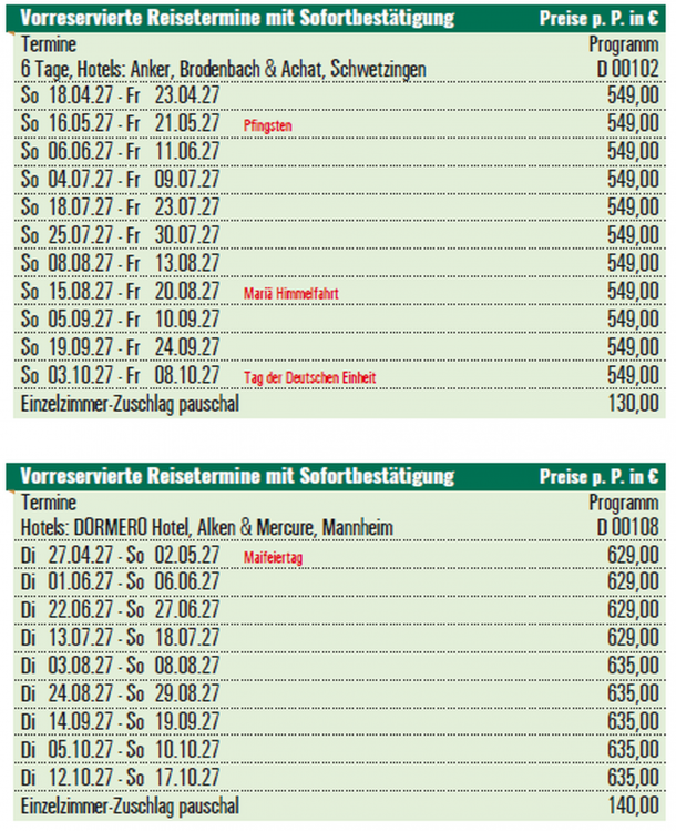 Vor Ort zahlbare Nebenkosten4. Tag: Fährkosten St. GoarBus pauschal € 22,00 + pro Pers. € 2,00
