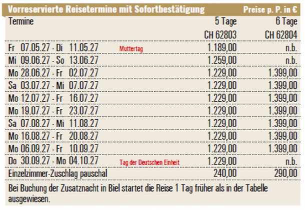 3. Tag: Aufpreis 1. Klasse im Glacier-Express (bei mind. 10 Pers. / max. 36 Plätze) pro Pers. € 115,00