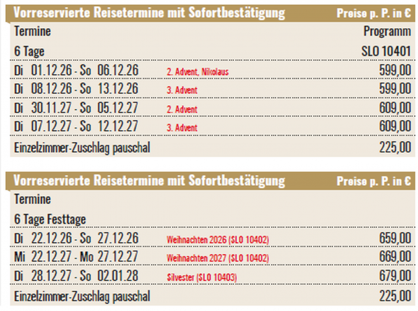 Wenn der Winter Slowenien in glitzerndes Licht taucht, entfaltet sich eine ganz besondere Atmosphäre zwischen Alpen, Seen und historischen Städten. Diese festliche Reise führt Sie in die charmante Region rund um Kranj, wo Natur, Kultur und Tradition auf stimmungsvolle Weise miteinander verschmelzen. Freuen Sie sich auf die zauberhaft beleuchtete Hauptstadt Ljubljana, auf idyllische Alpenpanoramen und romantische Spaziergänge am Bleder See. ...
