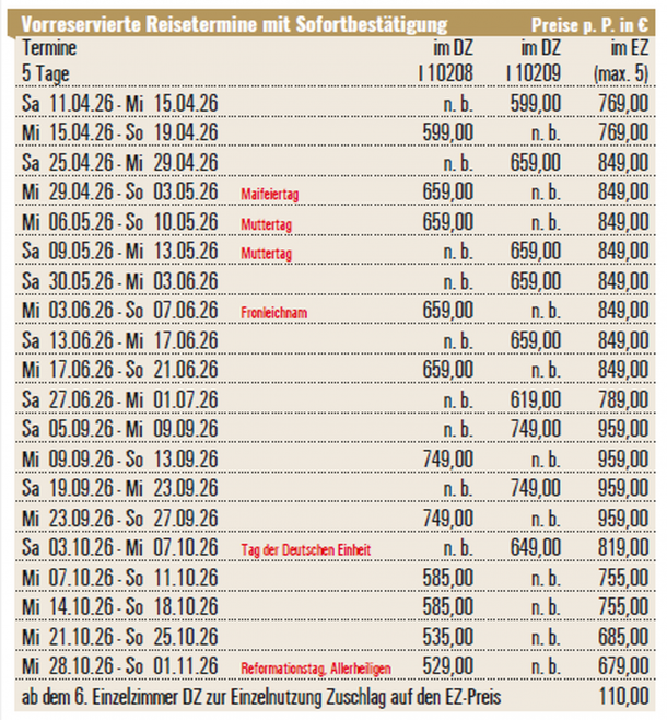 Vor Ort zahlbare Nebenkosten2. Tag: Ostern bis Mitte Oktober: Bootsfahrt Isola Madre und Isola Bella, Eintritte pro Pers. ca. € 44,00